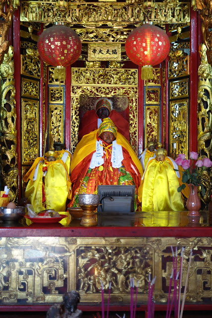 The central alter has an image of Mazu, flanked by Guan Gong, the god of war on her left, and Bao Sheng Da Di, the god of medicine, on her right.